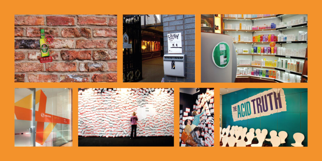 Cette année, l’entreprise fête son 20e anniversaire, ce qui signifie que nous fournissons des CLINGZ depuis deux décennies ! C’est en fournissant exclusivement des CLINGZ au Royaume-Uni que l’entreprise a démarré. En fait, Think Ambient s’appelait à l’origine « All Things Cling ». Le nom est devenu Think Ambient en raison des premières applications de CLINGZ. Les marques et les agences de médias utilisaient CLINGZ pour des applications de « médias ambiants » hors domicile, y compris le marketing de guérilla pour les marques de boissons et les spots « d’affichage » plus traditionnels. Au fil des ans, nous avons eu la chance de voir de nombreux exemples de projets. Vous trouverez ci-dessous quelques-uns des exemples historiques pour lesquels nous avons réalisé des photos :